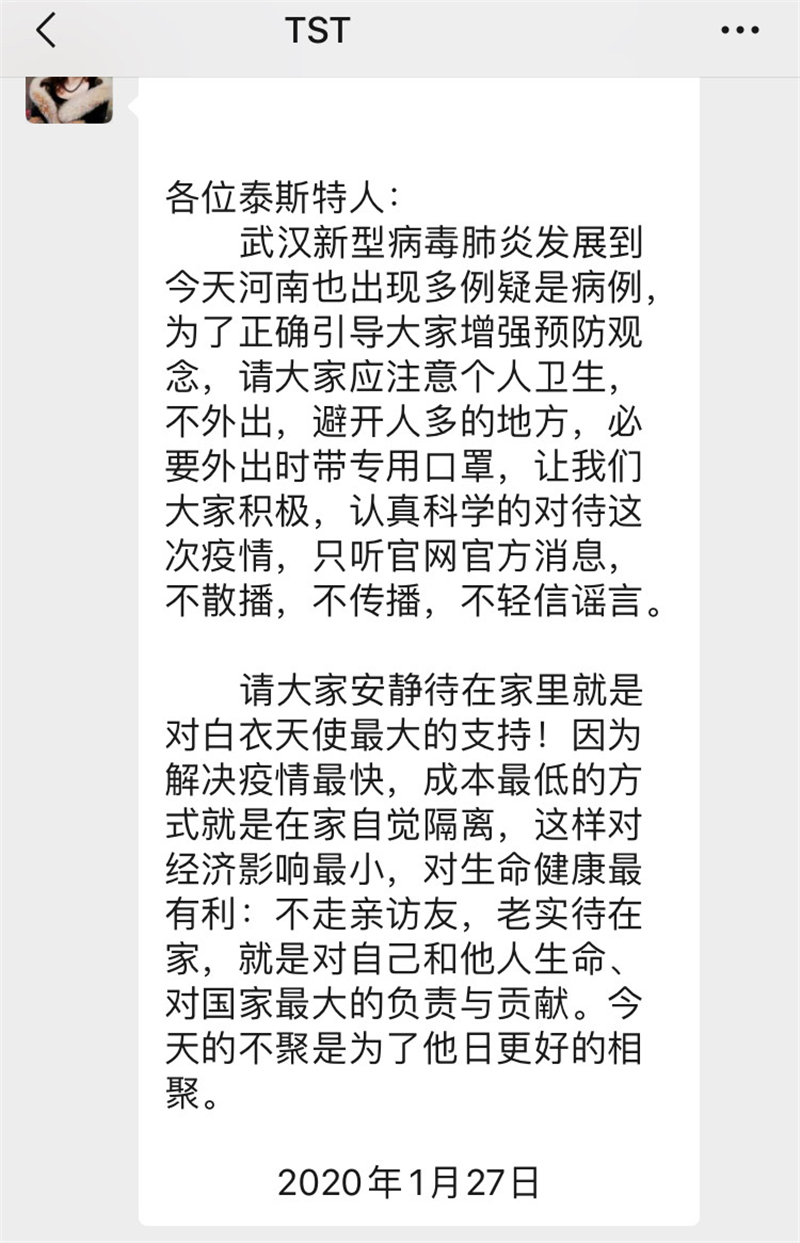 面向全體員工發(fā)布“告全體泰斯特人書”,統(tǒng)一全員思想,對抗疫情。